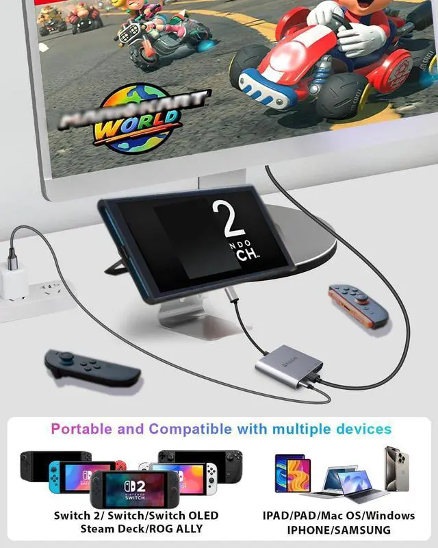 4K HDMI 2.1 Port: The Switch 2 dock/HDMI adapter supports up to 4K60fps for Nintendo Switch 2 and 4K120Hz for laptops. The Nintendo Switch 2 console itself only supports resolutions up to 4K60Hz/2K120Hz (the NS2 hardware is limited to 4K60Hz and cannot achieve 4K120Hz display). The higher-tier 4K120 support is compatible with laptops and high-resolution monitors, while also backward compatible with lower resolutions like 4K30, 1080P, and 720P. This product works with the Apple USB-C Digital AV Multiport Adapter and MacBook Air HDMI Adapter, allowing you to enjoy big-screen gaming anytime during travel or business trips.