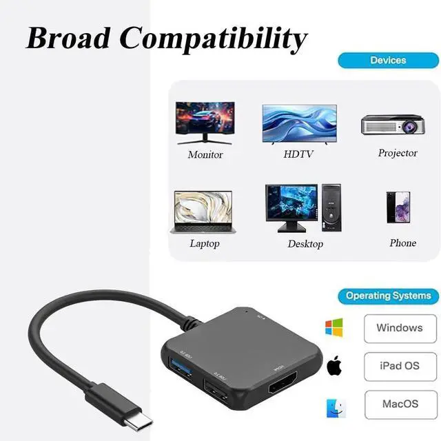 Broad Compatibility: This 4 in 1 USB C Hub is compatible with Mouse, Keyboard, Projector, DHTV, Monitor, MacBook Pro/ Air, Surface, supports Windows, macOS, Linux systems etc.