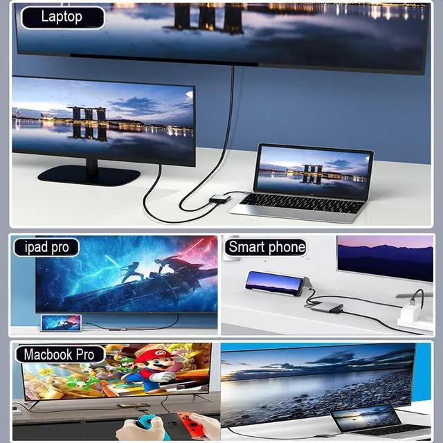 Wide Compatibility for USB-C DevicesThe HDMI splitter for dual monitors is plug-and-play compatible with a wide range of USB-C devices, including MacBook Pro, MacBook Air, iMac, iMac Pro, Mac Mini, iPad Pro (2020/2019/2018), iPhone 16/15/Pro Max, Chromebook, Dell, HP, and many other smartphones, laptops, and tablets. This USB C HDMI Adapter is compatible with Linux, Windows, Mac OS, & Android systems, with compatible Thunderbolt 3 and DP 1.4 alt mode.