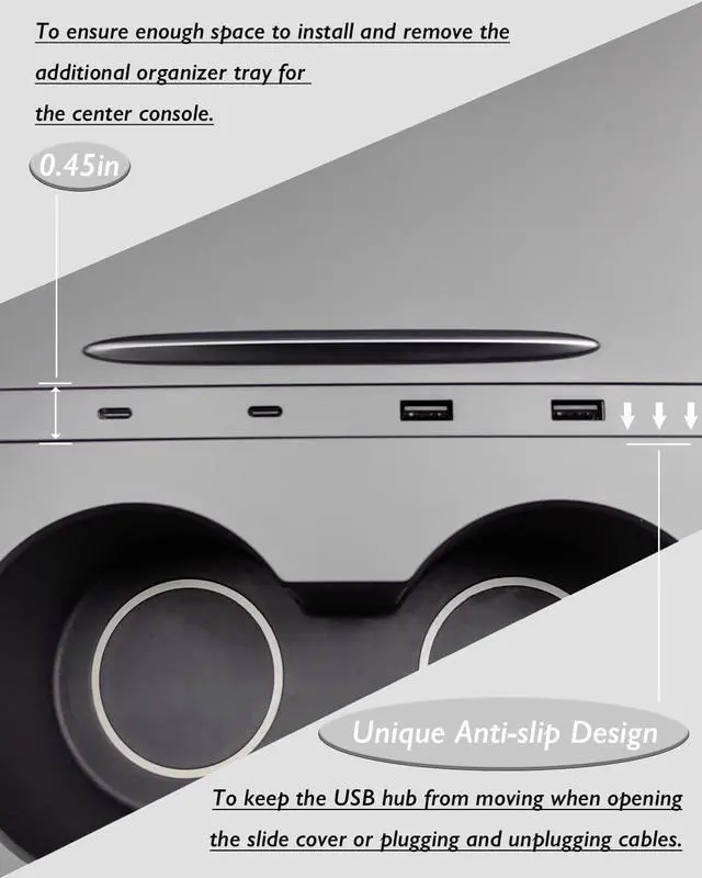UNIQUE ANTI-SLIP DESIGN: It keeps the USB Hub from moving when opening the center console slide cover or plugging and unplugging cables