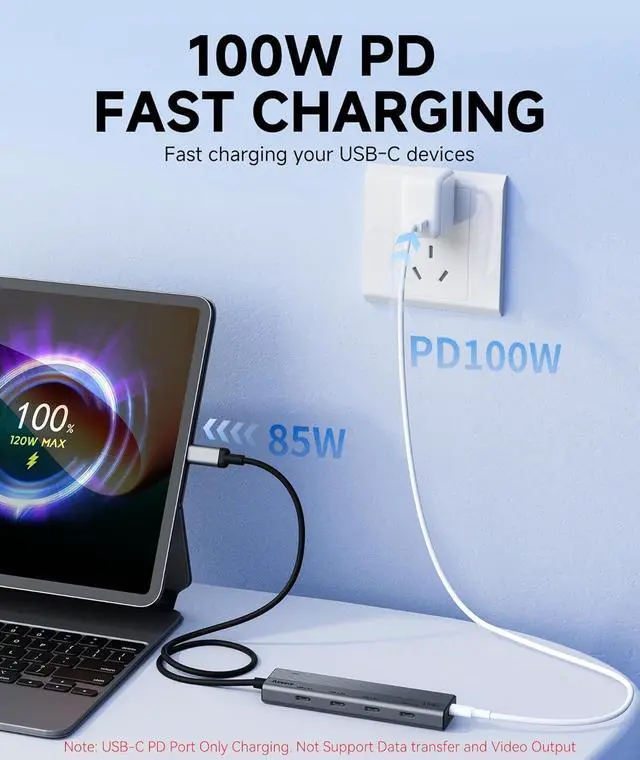 NOTE(1).The PD charging port of the hub is configured as PD2.0 protocol. Please be sure to use devices with PD2.0 protocol. The PD2.0 protocol will have the following, When the charger connected to the PD port is unplugged, the other USB ports of the hub will be disconnected for a few seconds and then restarted. This is normal and not a product problem.
