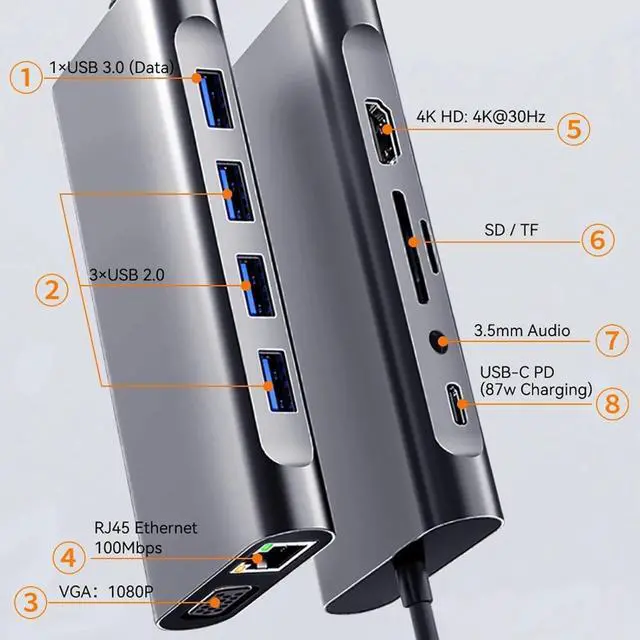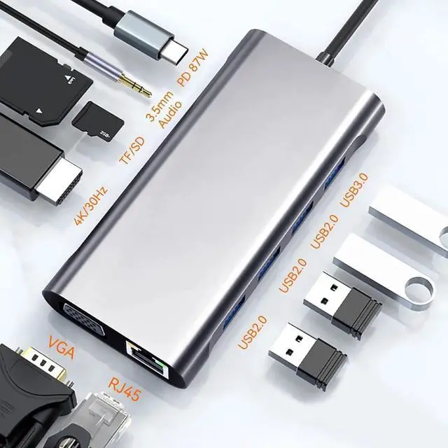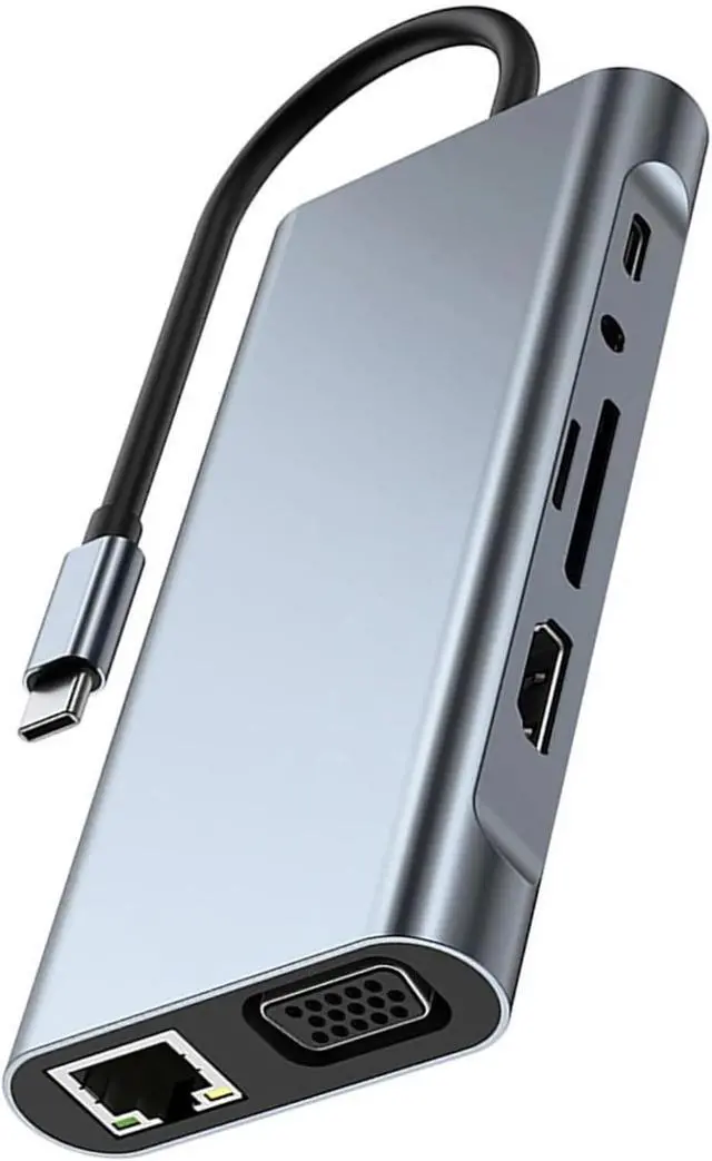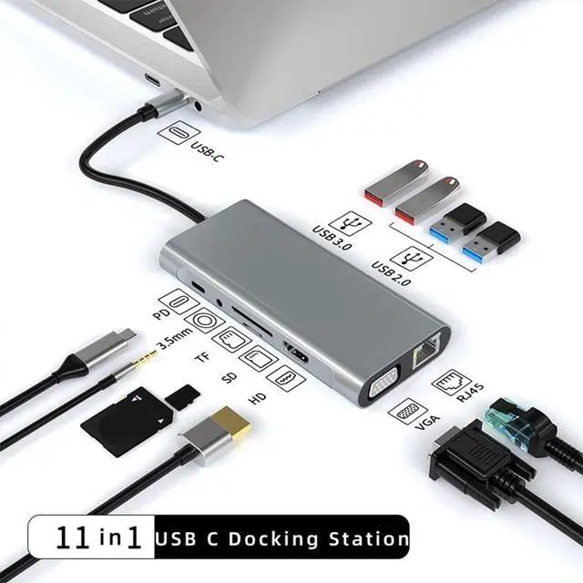 11 in 1 USB C hubs Adapter expands connectivitys with 4K hdtv, VGA, Ethernet, 4 USB port, Card slots, and 100WPD charging for Type C devices