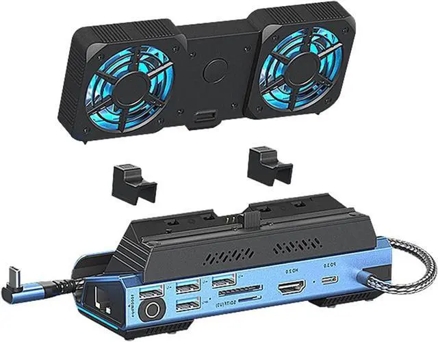 Elevates your gaming setups with this 9 in 1 docking station, featuring a detachable fan for cooling and connectivities.