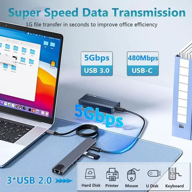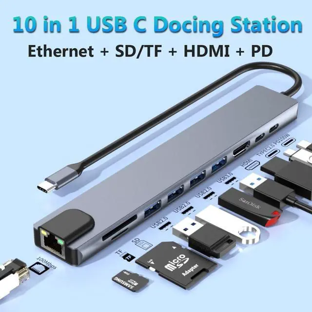 10-in-1 USB C Hub Multiport Adapter: The usb c ethernet hub transforms your laptop's single USB-C port into 10 essential ports, making it the perfect macbook usb-c adapter for busy professionals and students. Whether you're commuting or traveling, this usb c docking station allows you to connect usb c hub 4k@30hz hdmi, PD 100W fast charing, usb-c data port, SD/TF cards solt, Ethernet 100M, usb 3.0 and 3*usb2.0, no additional adapter required