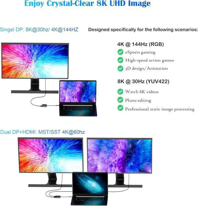 Enjoy Crystal-Clear 4K UHD Image: Our usb c adapters single port supports max resolution up to 4K@60Hz. When Use dual ports simultaneously, it supports max resolution up to 4K@30Hz. Support extend mode and mirror mode. Support MST and SST for win laptop. Please note the mac laptop only support mirror mode(CANNOT extend 2 different images on monitors).