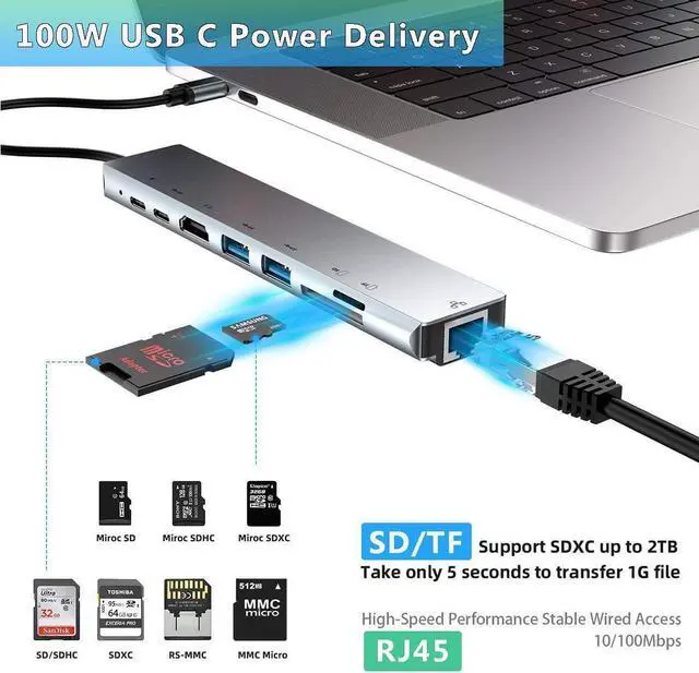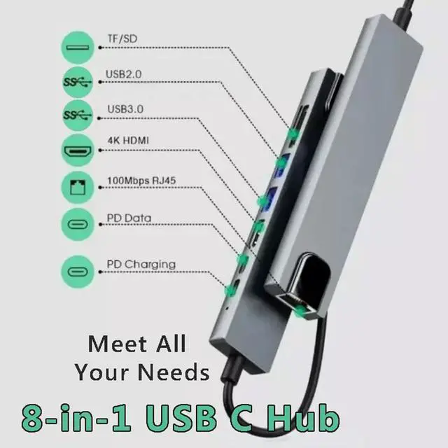 USB C HUB 8 IN 1: USB-C hub adapter is compatible with all devices that include Type-C/USB ports, especially for MacBook Pro/ Air. 8-in-1 USB-C HUB includes USB 3.0 port, USB 2.0 port, USB C data port, PD 100W charging port, 4K HDMI video output, RJ45 100M Ethernet interface and SD / Micro SD card reader slots, compatible with iPad Pro/ Air, iPhone 16 15 Pro Max, Chromebook and more Type-C devices. So that you can solve the problem of a single laptop interface anytime and anywhere