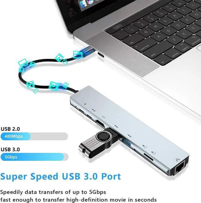 Surer Fast Data Transfer: The USB 3.0 port supports up to 5 Gbps transfer speed. The SD/TF slot can access files in a few seconds. The USB-C data port can transfer data to Type-C devices. The RJ45 100M Ethernet port provides more stable and faster Internet access than most wireless connections. (Note: SD/TF card cannot be read at the same time)