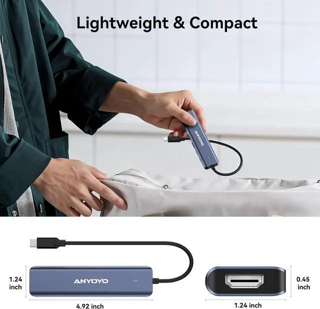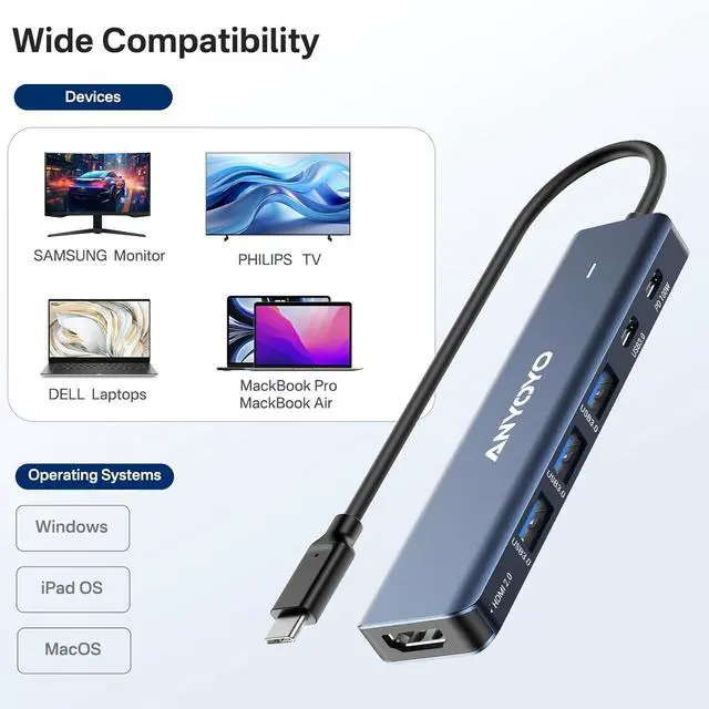 Wide Compatibility ANYOYO USB C Multiport Adapter compatible with multiple operating systems, including Windows, Mac, and Linux, suitable for various devices such as MacBook Pro, MacBook Air M1/M2, iPhone 15 Pro/Pro Max, iMac, iPad Pro, Galaxy S23, Chromebook, Surface, XPS, ThinkPad, etc. (Note: Please plug in PD charger when using with phone/tablet.). The usb c hub makes it easy to expand computer interfaces to meet diverse user needs.