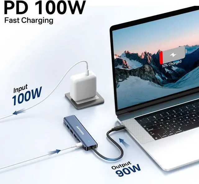 100W PD Fast ChargingEquipped with a 100W USB-C PD port, the max output power of Host is 90W. This usb c splitter could offer fast, efficient charging for your laptops/tablets/phones quickly(charger NOT INCLUDED).
