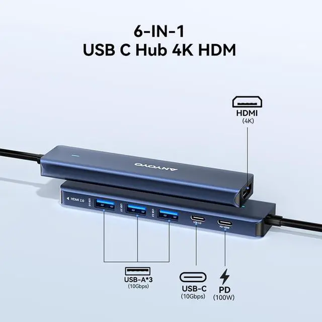 6-in-1 USB C HubThe USB C Hub Multiport Adapter features 1 HDMI port supporting 4K60Hz HD video ,100W USB-C PD port, 3 USB-A 3.0 and 1 USB-C 3.0.This USB C Adapter optimizes device output capacity, providing you with a simple solution for lack of ports and meeting your high-quality office and entertainment needs.