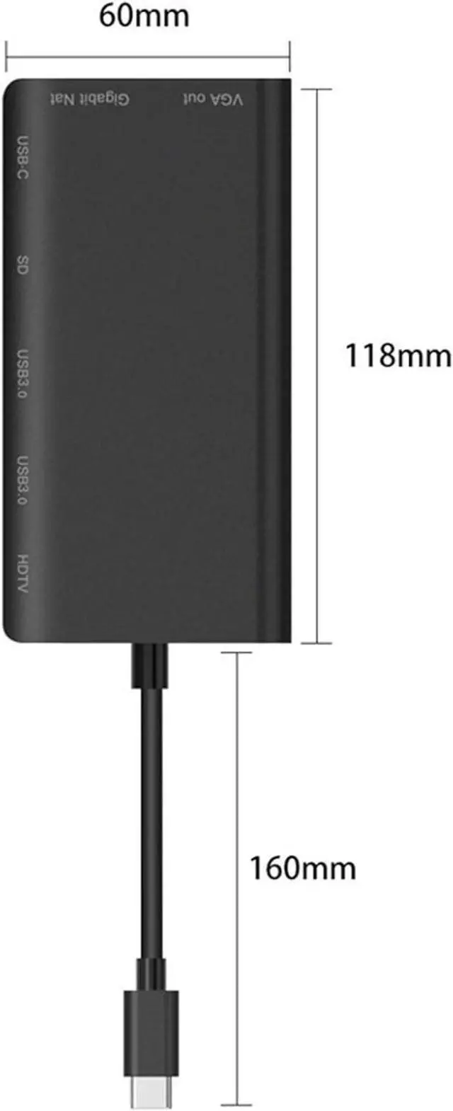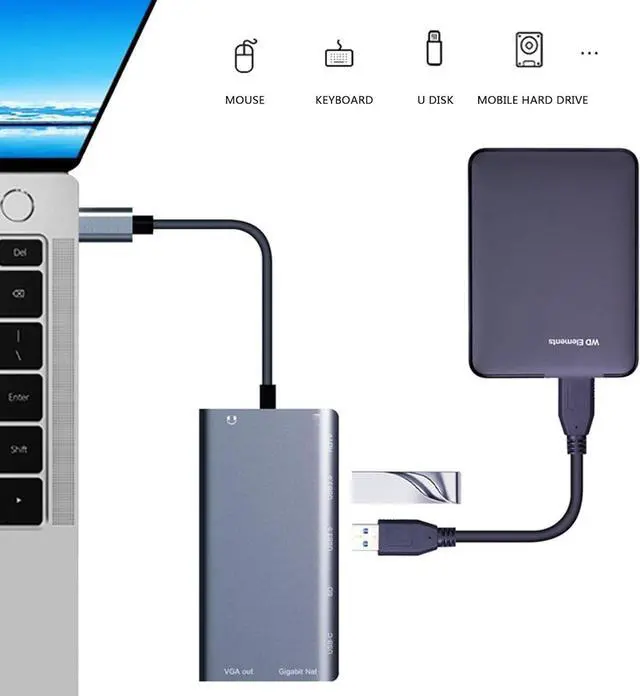 USB DOCKING STATION:7-in-1 USB hub with VGA interface, HDMI interface, two standard USB3.0 interfaces, Gigabit Ethernet, PD fast charging, SD card slot, plug and play
