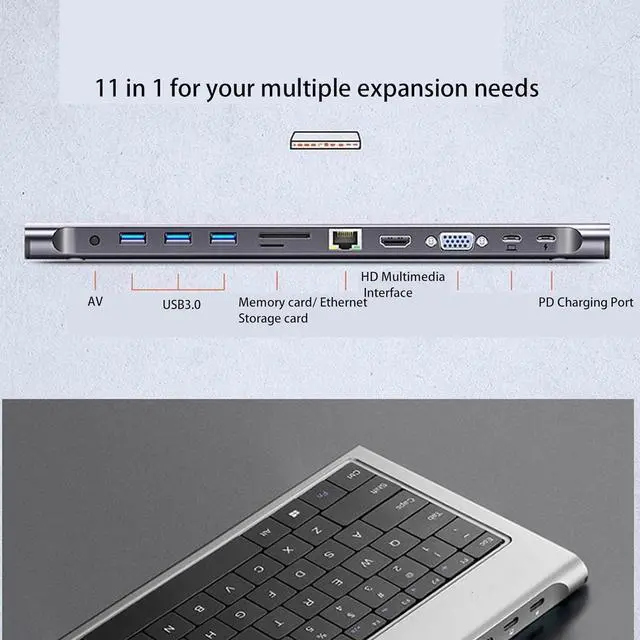 UP TO 11 PORTS: This USB C laptop docking station with 1 x VGA ports, 1 x HD Multimedia Interface port, 1 x USB C 3.0 ports, 3 x USB A 3.0 ports, 1 x Storage card slot, 1 x Memory card slot, 1 x Ethernet port, 1 x PD charging port, 1 x 3.5mm AV jack. This is a docking station for laptop with powerful functions.
