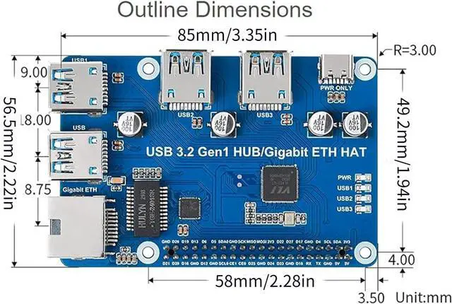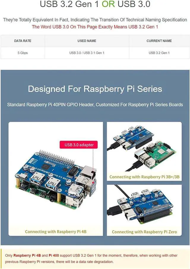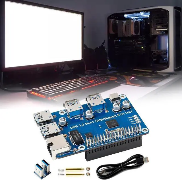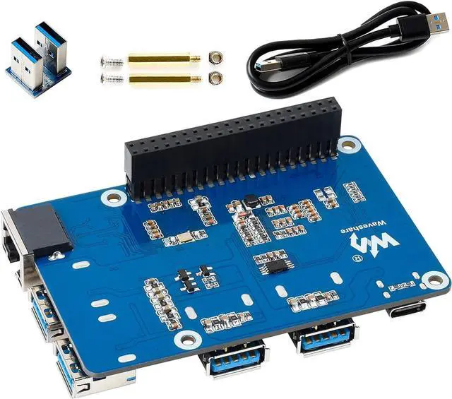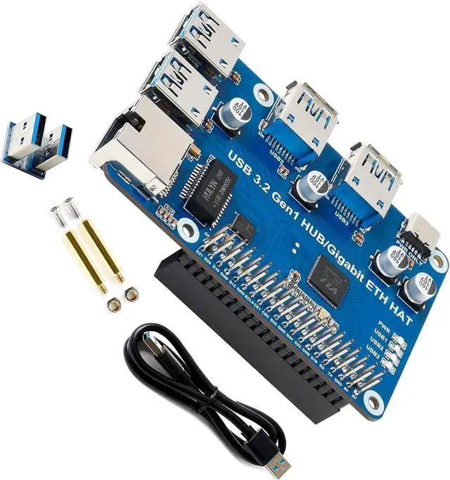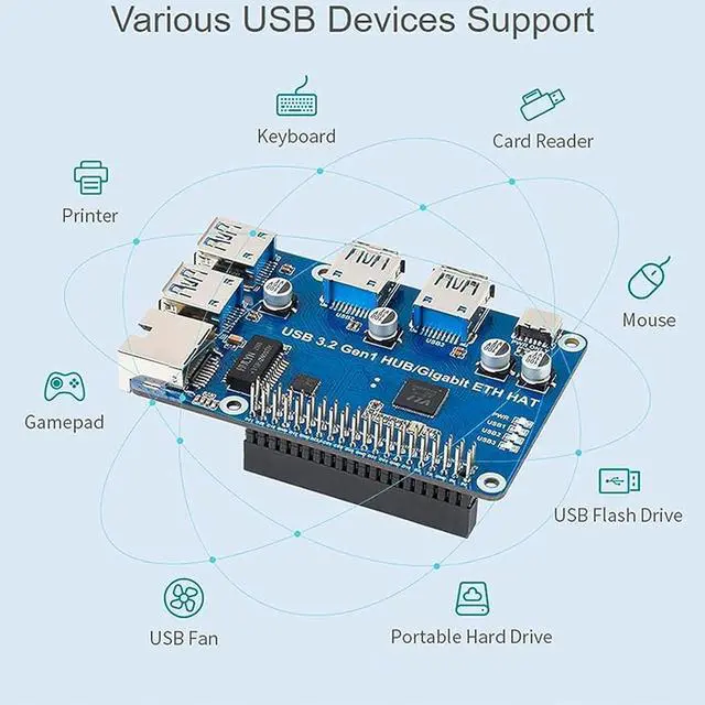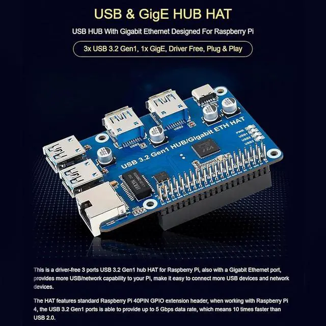 This is a Driver Free 3-Port USB 3.2 Gen1 Hub Hat for RaspberryPi. It also has a Gigabit Ethernet port to provide more USB network capabilities to RaspberrPi