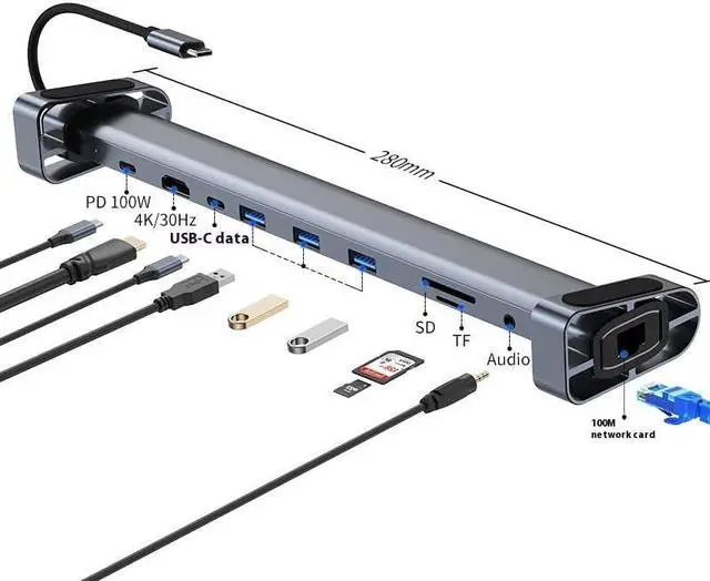 10 in 1 versatility :PD Charging power: 100W (Max) USB interface: USB3.0x3 Card reader interface: TF+SD(can not read at the same time) USB-C interface: USB-C data transfer Headphone port :3.5mm audio port HD resolution is 4K/30Hz Nic port: Supports 100 Mbit/s Ethernet cable Length: 135mm (including joint)