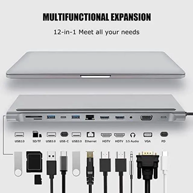 Fast USB 3.0 Data Transfer: Universal docking station combined with 2xUSB 3.0 ports (up to 5Gbp/s) connect smartphones, tablet, hard drives for effortless data transfer with USB-C port. USB C to Dual HDMI docking station allows you to connect keyboard or mouse without any lag. ,12in1 Docking