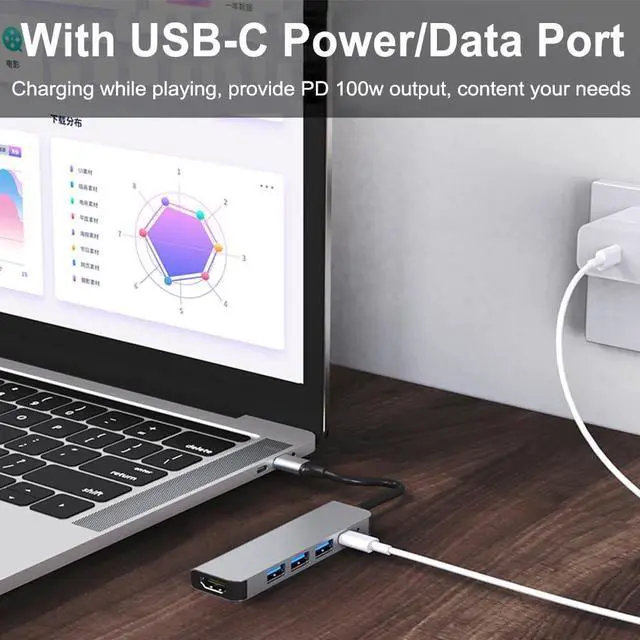 5 in 1 USB C Hub - Our powerful USB 3.0 multiport hub equipped with 1 4K HDMI port, 1 USB 3.0 port and 2 USB 2.0 ports along with 1 PD fast charging port. Compatible with a wide range of USB-C devices.A perfect solution for devices with limited USB port. Plug and play design ensures effortless setup, no need to set up any additional drivers.