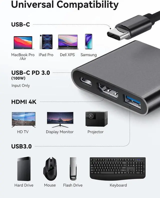 3-in-1 USB C to HDMI Adapter Fubiaofei USBC to HDMI multiport converter can expand your USB Type-C Port(Compatible Thunderbolt 3/4) into a 4k@30Hz HDMI output port, a 5Gbps USB 3.0 port, and a 100W Type-C fast charging port. This 3 in 1 USB3.0 Hub converter can satisfy more of your needs, enjoy charging, data transfer, and ultra audio-visual. All ports can be used simultaneously, no software or drivers required, plug and play.