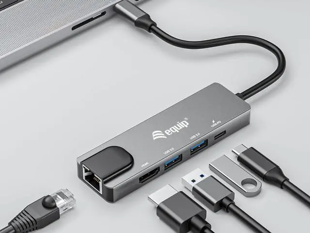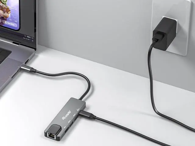 USB-C Male (Thunderbolt 3/4 Compatible) Supports HDMI resolution up to 4K/30Hz Gigabit Ethernet port with speeds of up to 1000 Mbps USB 3.2 Gen1 Super Speed (5Gbps) port x 2 USB-C charging port compatible with USB Power Delivery (PD) 3.0 technology