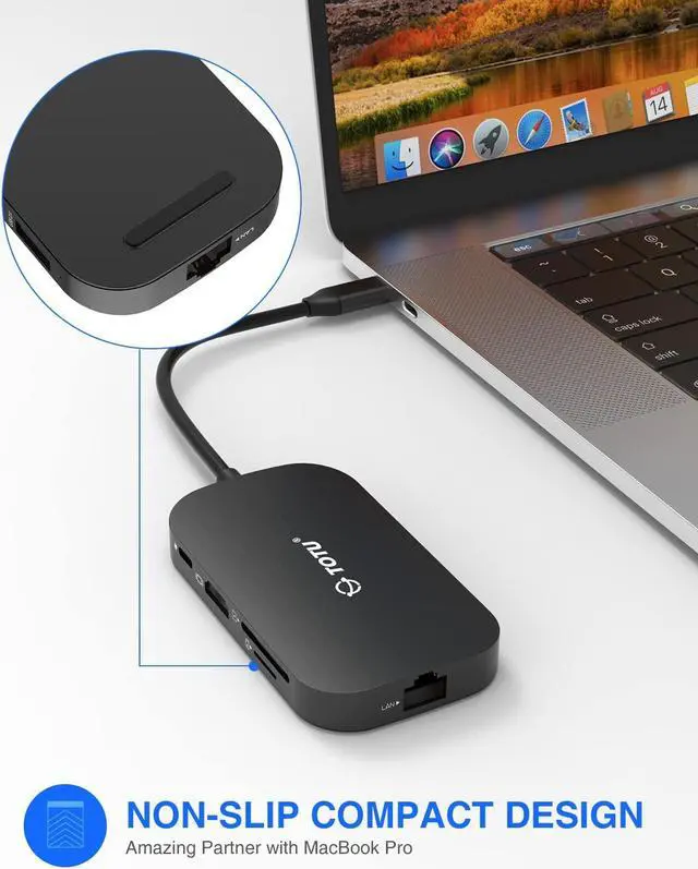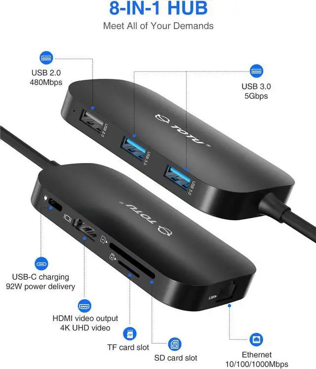 Multiport connection: TOTU USB C hub includes 1 Ethernet/RJ-45 Port, 1 USB Type-C Female PD charging port, 1 HDMI port, 1 SD card slot,1 TF card slot, 1 USB 2. 0 Type A port and 2 USB 3. 0 Type A ports. This USB C hub applies to all Type-C laptops supporting DisplayPort Alt Mode and Power Delivery.