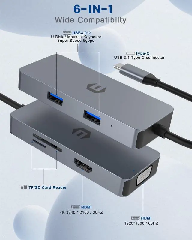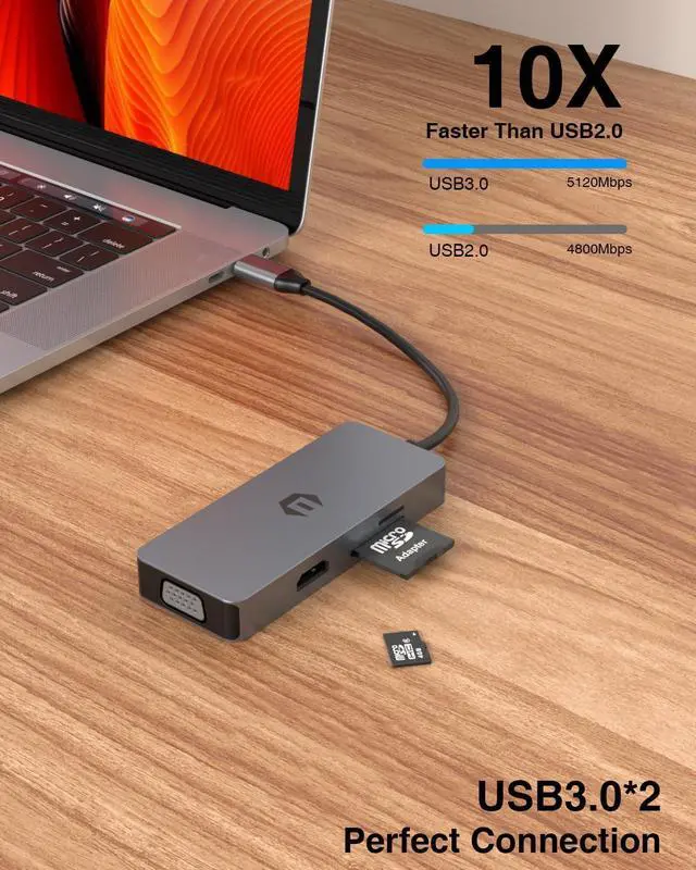 Incredible capability: TOTU 6-in-1 USB Type C hub includes 4K HDMI Output, VGA, 2 USB 3.0, SD/TF Card Reader. In extremely compact and sleek design.