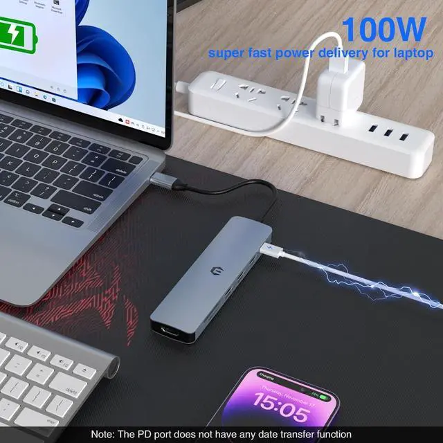 Powerful 100W Charging: This USB C hub supports a maximum power input of 100W. Rapidly charging for connected MacBook Pro/Air devices. Simply connect your laptop's power cable to the USB-C PD port. For safety, the USB C adapters include a protection system that guards against overloads and overheating (high temperatures).