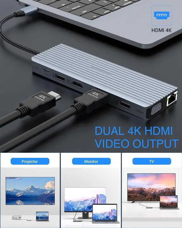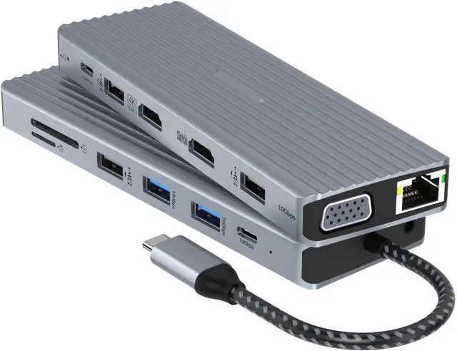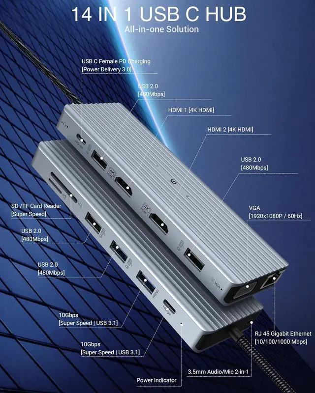 • [Multiport Dockingstation]- Meet all your daily work and life port needs with 14-in-1 hub, including 24K HDMI, 1VGA, 1USB A 3.1, 1USB C 3.1, 4USB A 2.0, Gigabit Ethernet, SD&TF, 100W PD, and 3.5MM Jack.