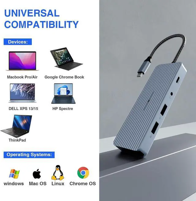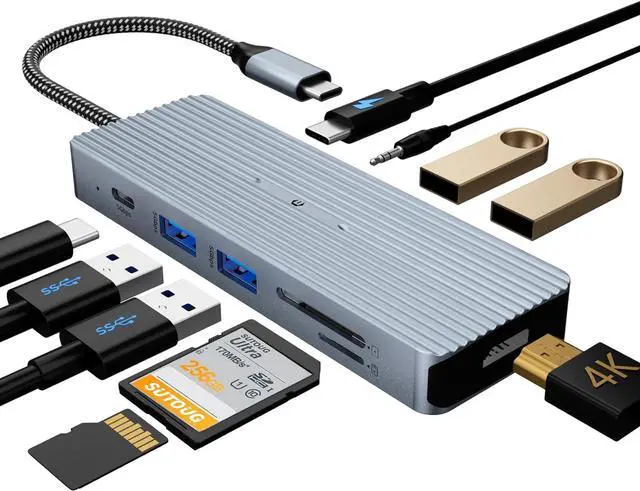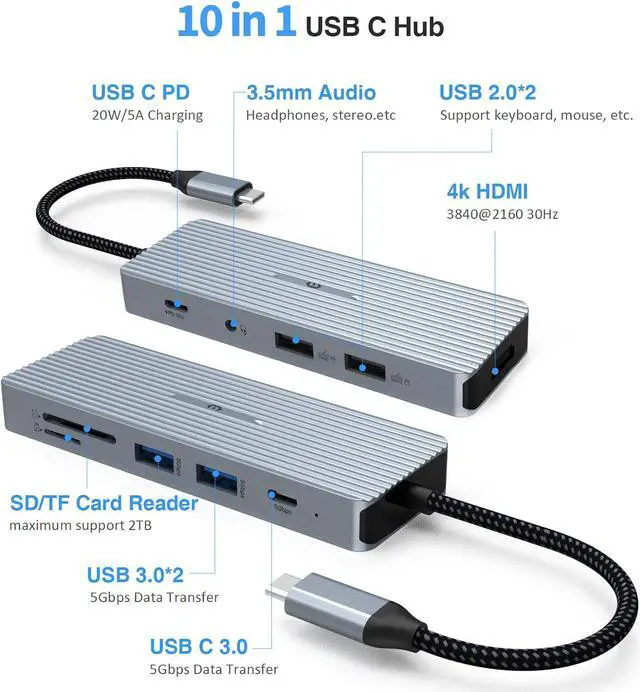 [10-in-1 USB C Hub]- Expand your laptop's capabilities with this versatile docking station, featuring 4K HDMI, USB 3.0, USB-C data transfer, USB 2.0, SD, TF, USB C PD, and a 3.5mm stereo combo jack.