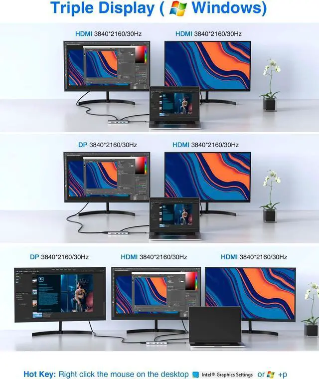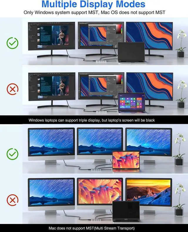 Triple Display USB C Hub for Windows: Only support the Triple display for Windows. 3840x2160 output only available when using HDMI or DP display or mirror the three displays. In extend mode, each will be limited to a maximum resolution of 1080P. Please note ONLY Windows system support extend and mirror mode , Mac ONLY offers mirroring the two external displays.