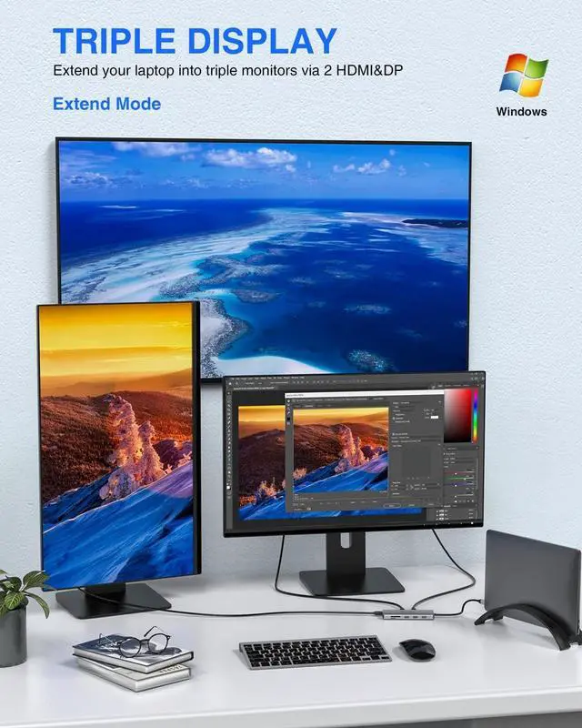Portable & Plug-play USB C Hub : Compare to the cumbersome docking station with no interface and dual display traditional USB C Hub, the USB C Hub is easy to set into your laptop sleeve, bag or pocket. Plug-play, no need to download any drivers. Easy achieve multi-display (Mirror Mode/Extend Mode), bring you a different visual experience.