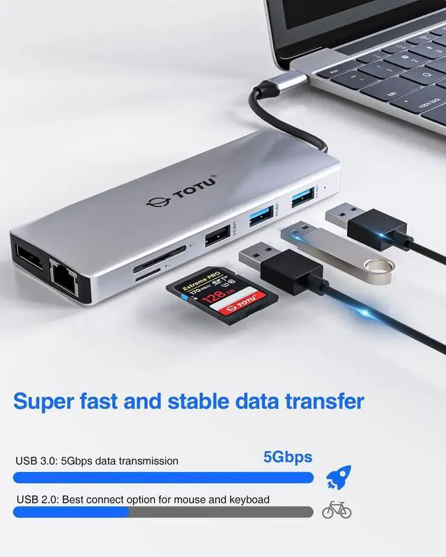 Efficiently USB C Hub : 2 USB 3.0 ports transmission speed up to 5 Gbps. Two USB 2.0 ports support and SD/TF card slots data transfer at up to 480Mbps. Due to the USB 3. 0 radio frequency interference, it is advisable to connect the USB 2. 0 port. Gigabit Ethernet port supports 10/100/1000Mbps network speeds, anywhere and in just a flash.