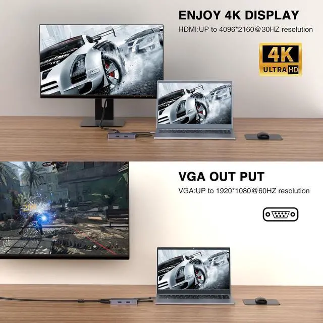 • Remarkable Resolution USB C HubImmerse yourself in high-resolution visuals with the remarkable resolution support of this USB C hub. The HDMI port supports up to 4K@30Hz (requires a 4K HDMI adapter cable and a display that supports 4K resolution), while the VGA port supports up to 2K@60Hz. The VGA port is also downward compati