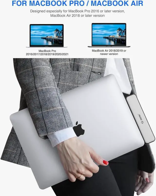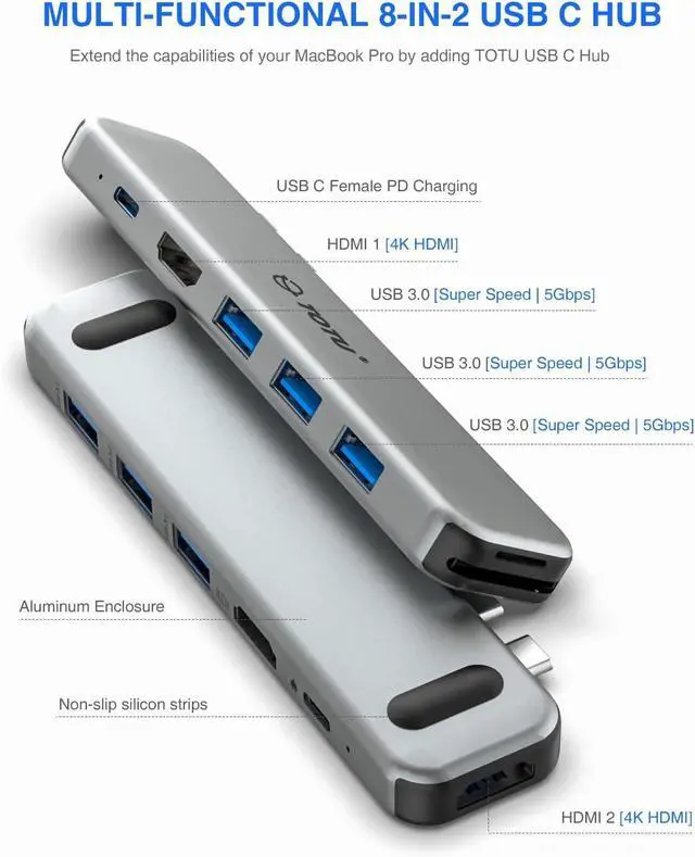 8 in 2 USB C Hub For MacBook Pro & MacBook Air: TOTU USB C hub multiport adapter is specially designed for MacBook Pro 2016 - 2021, MacBook Air 2018 or later version. Equipped with dual 4K HDMI ports, 92W USB-C power delivery port, 3 USB 3.0 ports, card reader slots for SD/TF. Please note: MacBook Pro & MacBook Air 2020 with M1 chips support only ONE HDMI monitor expansion - which means the 2020 version MacBook Pro/Air cannot fulfilled external two displays simultaneously.