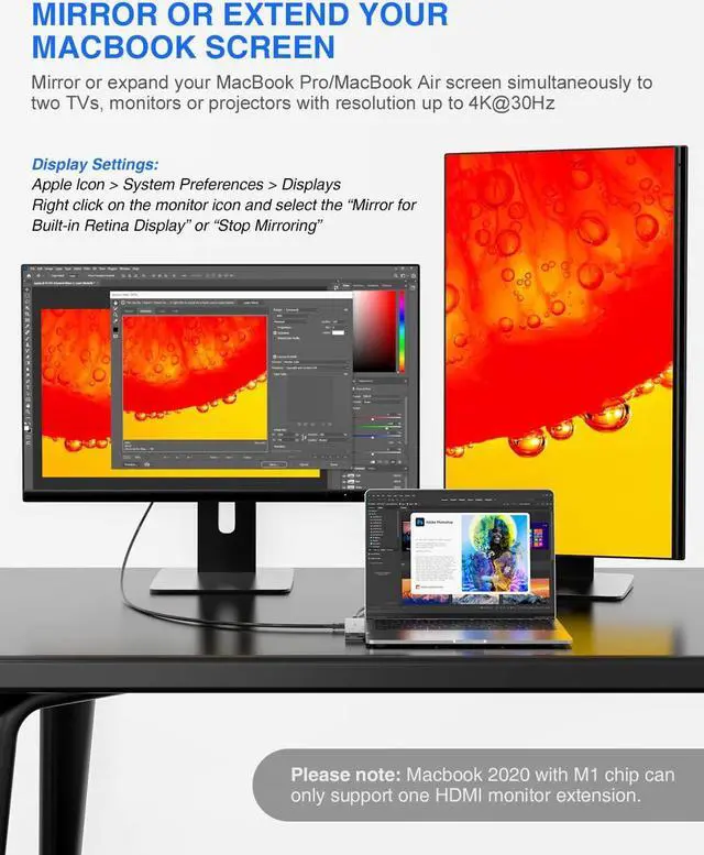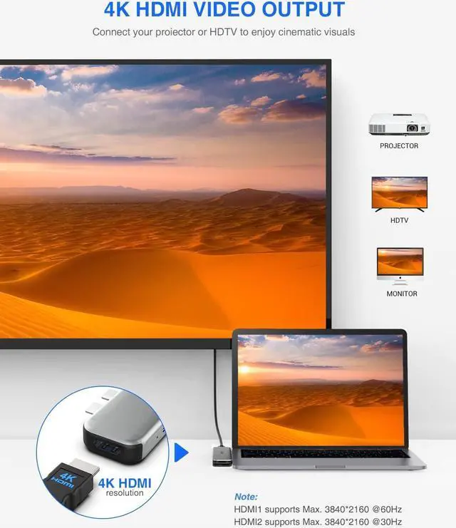 Triple Display & 4K HDMI Output: This MacBook USB C hub supports triple display with MacBook + HDMI1 + HDMI2 (except for the M1 chip MacBook Pro/Air). Thus you are able to mirror or expand your MacBook Pro/Air screen to external two TVs, monitors, or projectors, ect. Bringing you a theatrical visual feast and boosting your efficiency 3 times more.