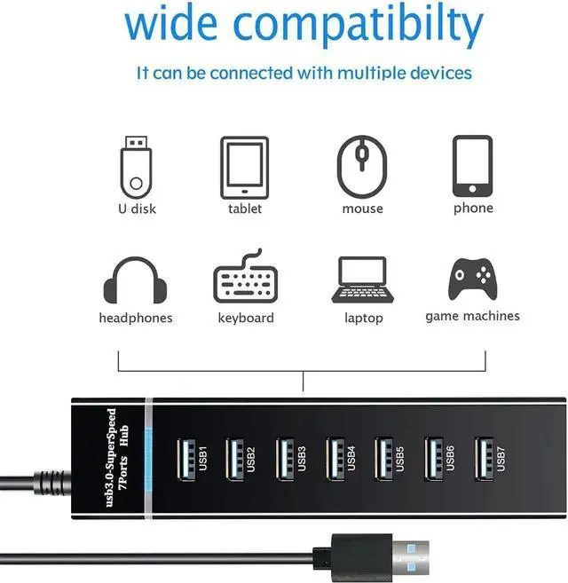 Expanding your connections and multiple devices with this 7 ports USB 3.0 hub. It support most common USB devices like U disks, mouse, card readers, keyboards, gaming devices, mp3 players, HDD, etc.