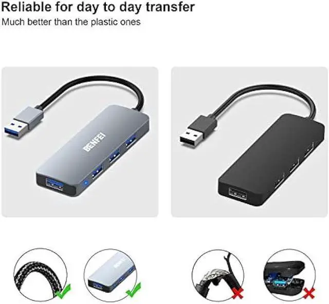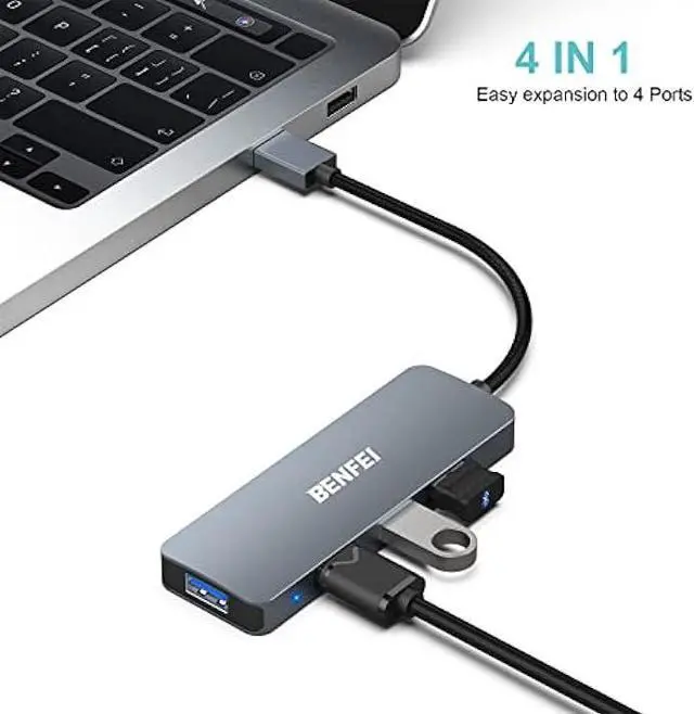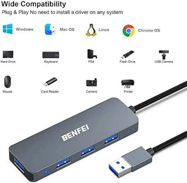 Easy Expansion: BENFEI 4-Port USB 3.0 Hub adapter expands your laptop with 4 addtional USB 3.0 Port. Compatible with laptop, pc, XBOX, PS4, PS5, flash drive, keyboard, mouse, card reader, HDD, cellphone OTG adapter, printer, webcam, USB fan and USB cables