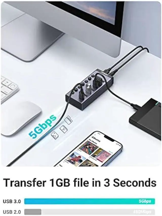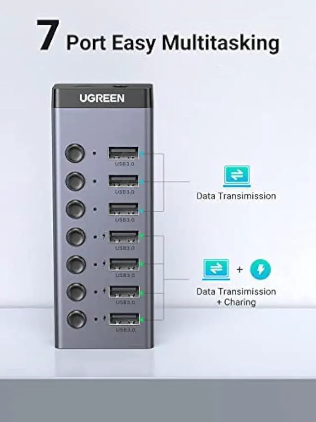 Superspeed Data Transfer: UGREEN 7 in 1 USB Hub turns 1 port into 7 USB 3.0 ports, provides up to 5 Gbps data speeds allowing you to transfer an HD movie in seconds. This 7 port USB splitter is suitable for keyboard, mouse, webcam, flash drive, HHD, SSD and charging helps to expand more possibilities and makes life easier. Equipped with 3ft long USB cable, easy to reach the USB ports at the back of the host