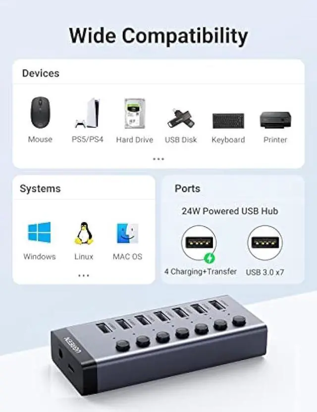 Stable Connection: UGREEN USB 3.0 hub support an external 12V 2A power supply to improve load capacity keep the high power device running stably. This powered USB hub is compatible with most operating systems: Windows XP Vista 7 8 10 11, MacOS, UNIX, Linux and offers a plug and play installation
