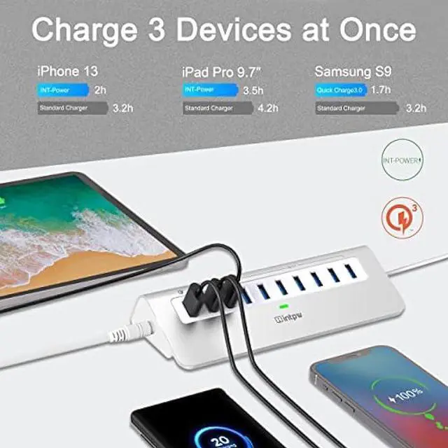 3 x Fast Charging Ports: intpw USB charging hub equipped with Quick Charge 3.0 port offer a charging power up to 18W and also backwards-compatible with all versions of Qualcomm Quick Charge technology ( 1.0, 2.0 & 3.0 ). 2 INT-POWER fast charging ports using intpw's exclusive charging technology also deliver the fastest possible charge of up to 2.4 amps per port for Qualcomm Quick Charge incompatible devices.