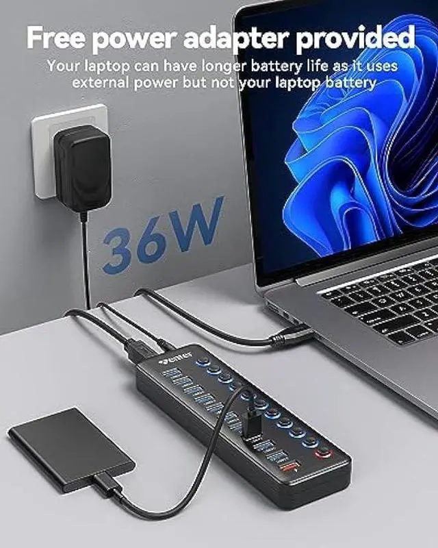 Longer Cables: Our USB 3.0 hub comes with a 100cm( 3.3 ft) USB cable and 120cm (4ft) power cable, enough length to let you arrange your cables anywhere.