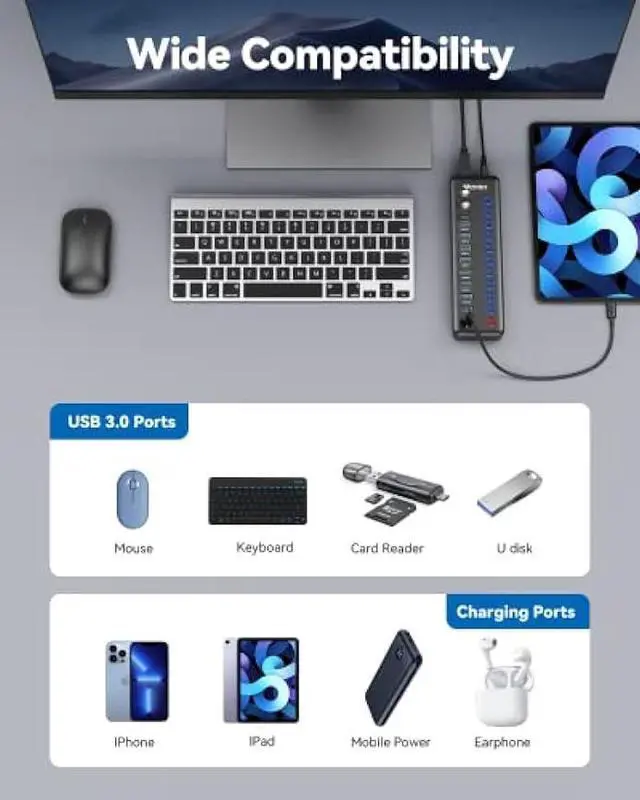 Wide Compatibility: USB 3.0 Power Hub is compatible with Windows XP / Vista / Win 7 / Win 8 / Win 10, Mac OS, Linux 9 and above, supports any USB 3.0, USB 2.0, USB 1.1 and USB 1.0 peripherals; Fully plug and play, no drivers required and supports hot-swapping.