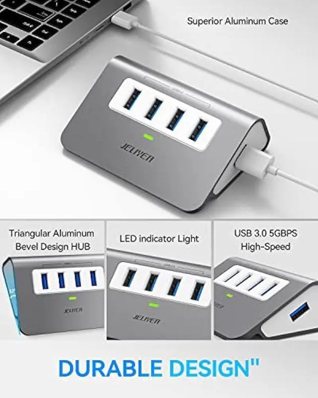 UNIBODY ALUMINUM/HUMANITY DESIGN: The USB HUB adapter is designed in a triangular aluminum alloy shape, which is more suitable for placing it on the desktop and more convenient for plugging. IT can plug 4 flash drives at the same time. The LED indicator is identifiable but is never disturbing at night. Built-in smart chip and aluminum shell avoid overcurrent, overvoltage, short circuits and high temperature. Compact and lightweight, perfect for traveling.