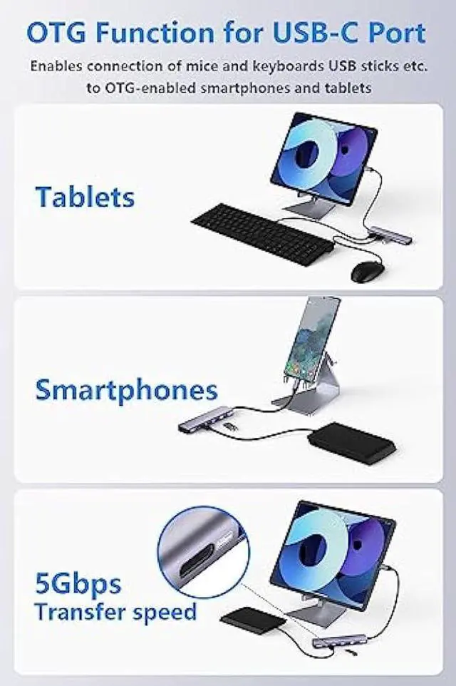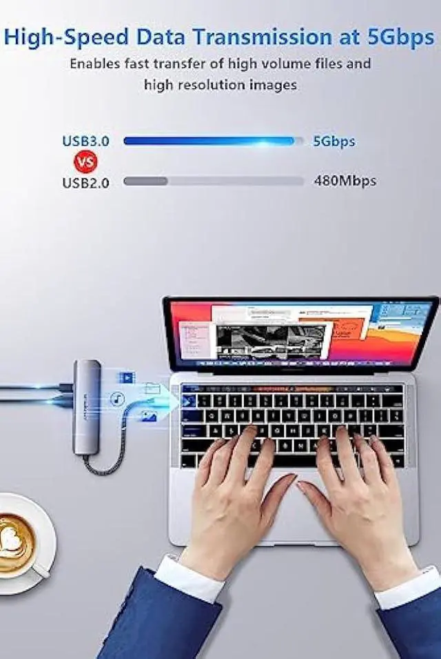 5Gbps USB-C & USB 3.0 Data Transfer The USB C multiport adapter offer USB-C and 3 USB-A data ports, allow you to connect keyboard, Mouse, U disk, hard drive and etc to MacBook Pro/ Air, provide file transfer at speeds up to 5 Gbps. No need wait for data transfer and working will be more efficient!