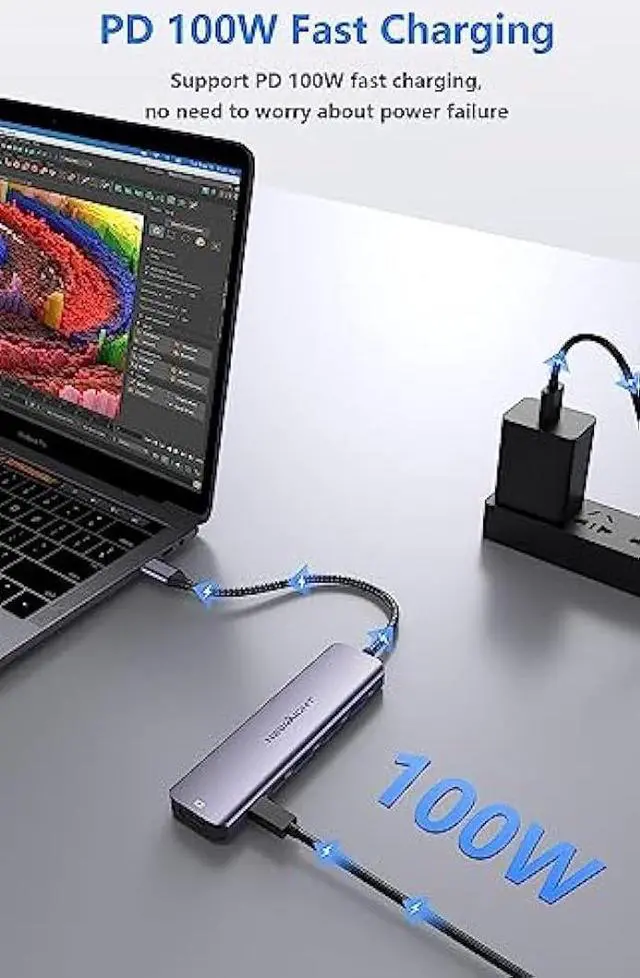 100W Pass-Through Charging Compatible with USB-C Power Delivery, can pass up to 100W power. You can charge and play at the same time. No more worrying about low battery when multitasking using the USB C Dongle. The actual charging rate may vary depending on device, cable & charger used.