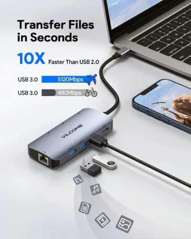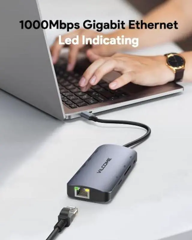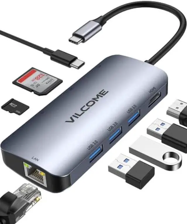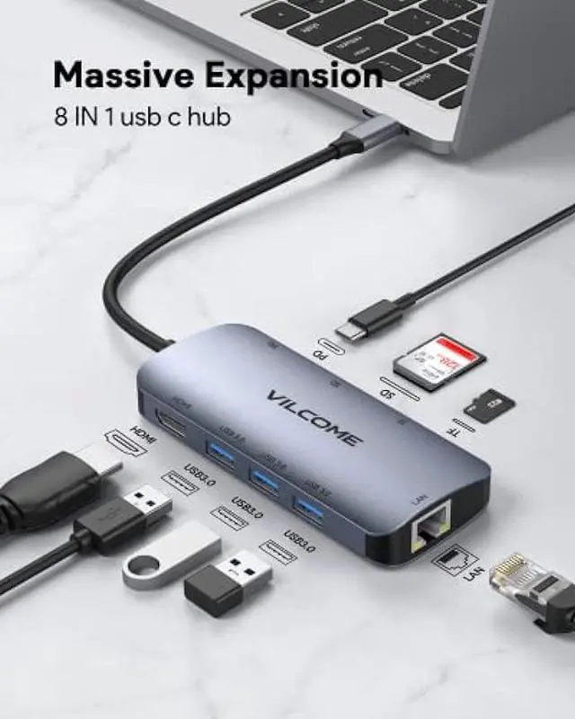 USB C Multiport Hub (8-in-1) This usb c hub expand a single USB-C port to connect more, Vilcome 8 in 1 USB-C adapter features a 4K HDMI output port, 3 USB 3.0 ports, ethernet port, SD/TF card readers. And all hub ports can work simultaneously.