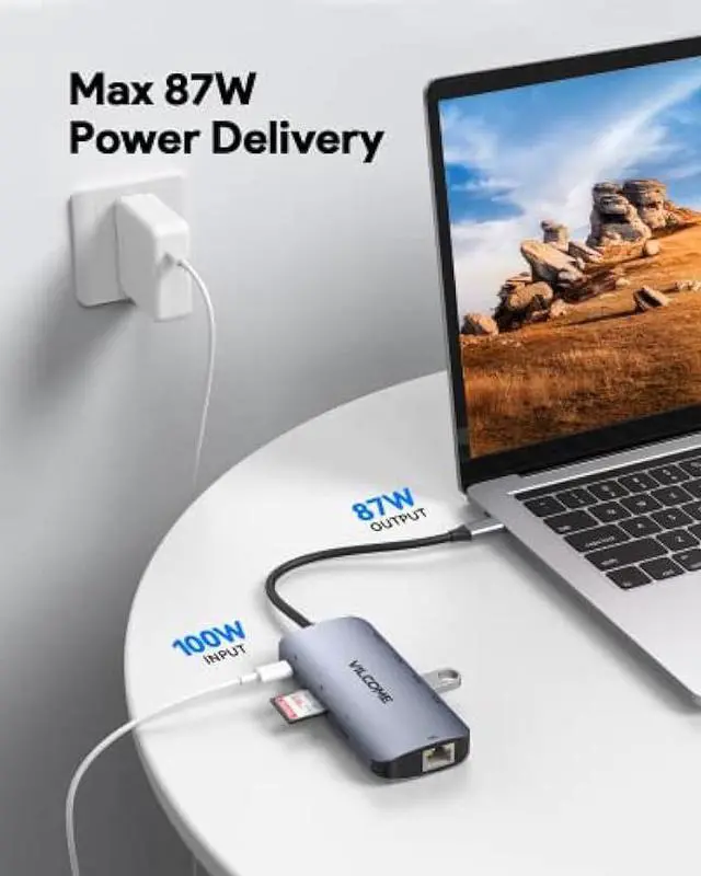 Power Delivery: Support PD charging at max 87W, This USB C multiport adapter provides one Type-C pass through female port by which you could securely charge connected MacBook or other Type-C laptops.