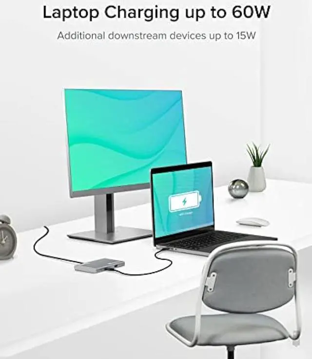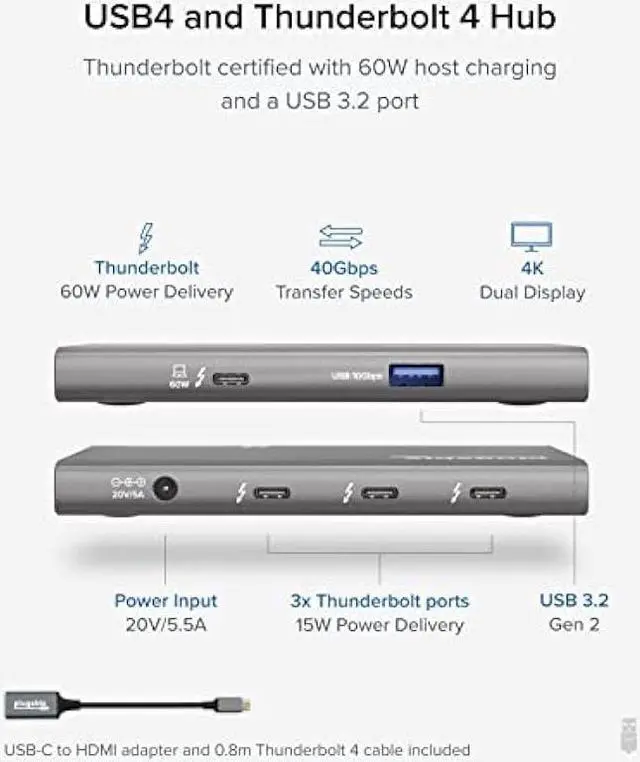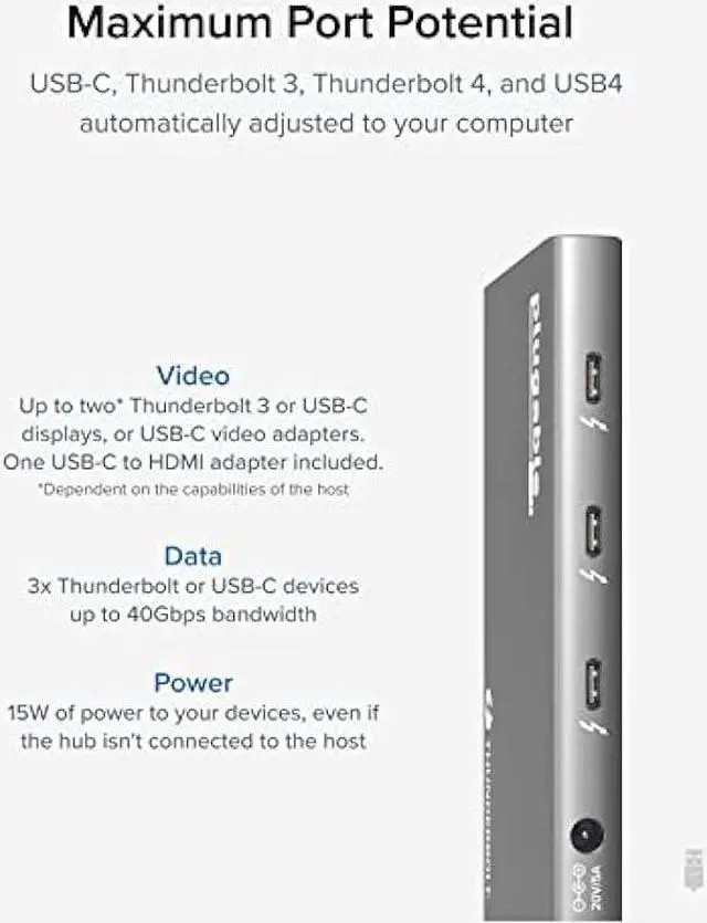 Powerful Ports - 3x Thunderbolt 4 / USB4 ports for speeds up to 40Gbps, and 15W charging for phones and tablets. 1x USB-A up to 10Gbps, 1x upstream Thunderbolt 4 port up to 60W charging to host