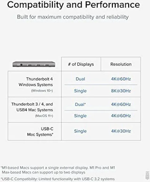 Compatibility - Windows (10+) with Thunderbolt 4 / USB4, macOS (11+). Thunderbolt 4 / USB4 dock supports 2x 4K screens at 60Hz, one 8K screen at 30Hz or 1x 6K on M1 Macs (1x USB-C to HDMI 2.0 adapter included). Thunderbolt 3 Windows systems not recommended