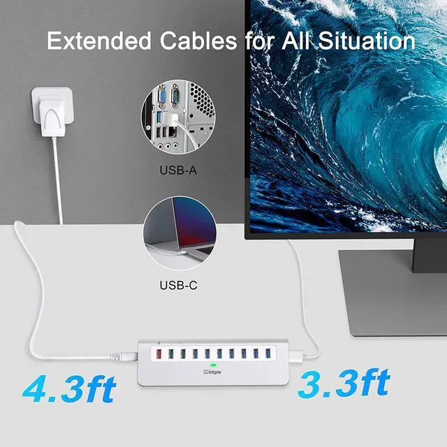 SuperSpeed Powered USB Hub: Intpw USB 3.1 hub equipped with 7 super speed USB 3.1 (USB 3.2 Gen 2) ports allows you expend multiple USB port for laptop and transfer files at speeds up to 10 Gbps, twice the data transmission rate of conventional USB 3.0 in theory. The USB hub for laptop gives you the opportunity to simultaneously connect a large number of USB peripherals such as keyboards, mice, card readers, and more USB devices.