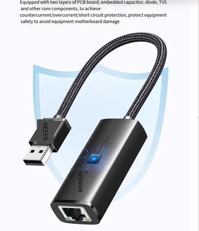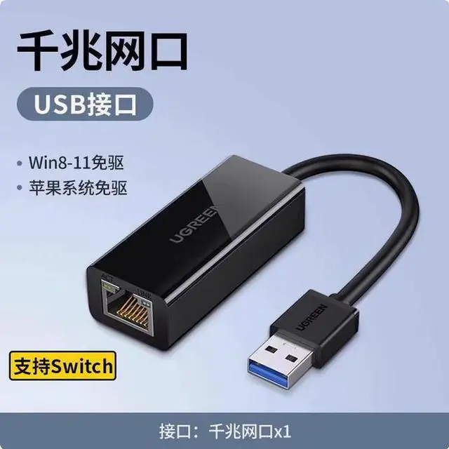 Brand: UGREEN) Product name: USB Gigabit network card Model: 15638 Function: Network port expansion Material: ABS rubber shell, braided wire body Packing size: 115*115*23mm Net weight: about 26.7 g Packing weight: about 57.1 g