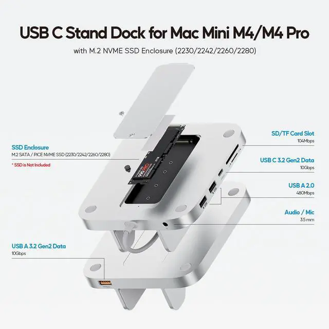 NOTE: 1) SSD NOT Included. 2) DOES NOT support SATA SSDs; 3) Please initialize the new SSD because SSDs must be formatted to work with host in order for SSD to mount and show up; 4) Please format your new SSD into "exFat" or "apfs " format